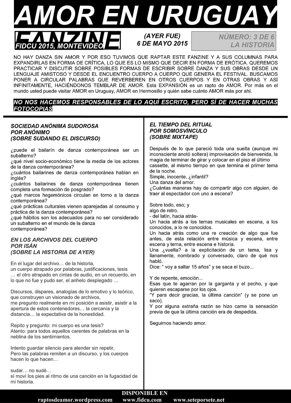 Pensando en modos de generar crítica coreográfica, deseando reverberar lo sucedido en el escenario o la sala y expandir la danza en más sentidos que el unidireccional artista – público. Gestándose en México y sumando referencias e ideas, AMOR llegó a Uruguay de la mano de Proyecto Pulpo como proyecto asociado de fidcu#2013. Bajo la idea-necesidad de expandir el amor a la participación de muchos colaboradores, el fanzine fue apropiado y continuado en el marco del Laboratorio de Escritura a cargo de Lucía Naser y Micaela Moreno Magliano en fidcu#2014. "La adrenalina de lo publicado. La desublimación de lo “publicado”. La voz del crítico como una más, generando cruces. Preguntas. El despertar temprano, o dormir tarde, procesando y traduciendo en palabras lo que se acaba de ver. Se cierra a las 11. Se imprime a la 1. Se reparte a las 2. Lo incierto. El no sé pero voy haciendo. La vulnerabilidad en el nombre propio y ajeno. Propusimos la crítica como juego y como ensayo, como terreno para el error y eventualmente algún acierto. Como ámbito no judicial ni (auto)evaluativo sino poético y reflexivo. Nos interesó lo que podría provocar poner sobre la mesa miradas sobre las danzas que veíamos. Nos encontramos con generosidad escritora y lectora, con la expansión de un amor por el diálogo, con la contracción del ego como mediador entre artistas, público y crítico, con la alegría más que con la preocupación. Al escribir. Con la pregunta ¿escribir o no bajo pseudónimos? Cuestión a investigar en próximos romances. Con la pregunta ¿qué produce escribir desde marcos/temás/disparadores? (...) La crítica transvestida o metamorfoseada. Eligiendo una premisa para la improvisación". (Mass A. More, "Raptos de Amor" en Fanzine AMOR EN URUGUAY, 7 de 6, FIDCU, 2014).